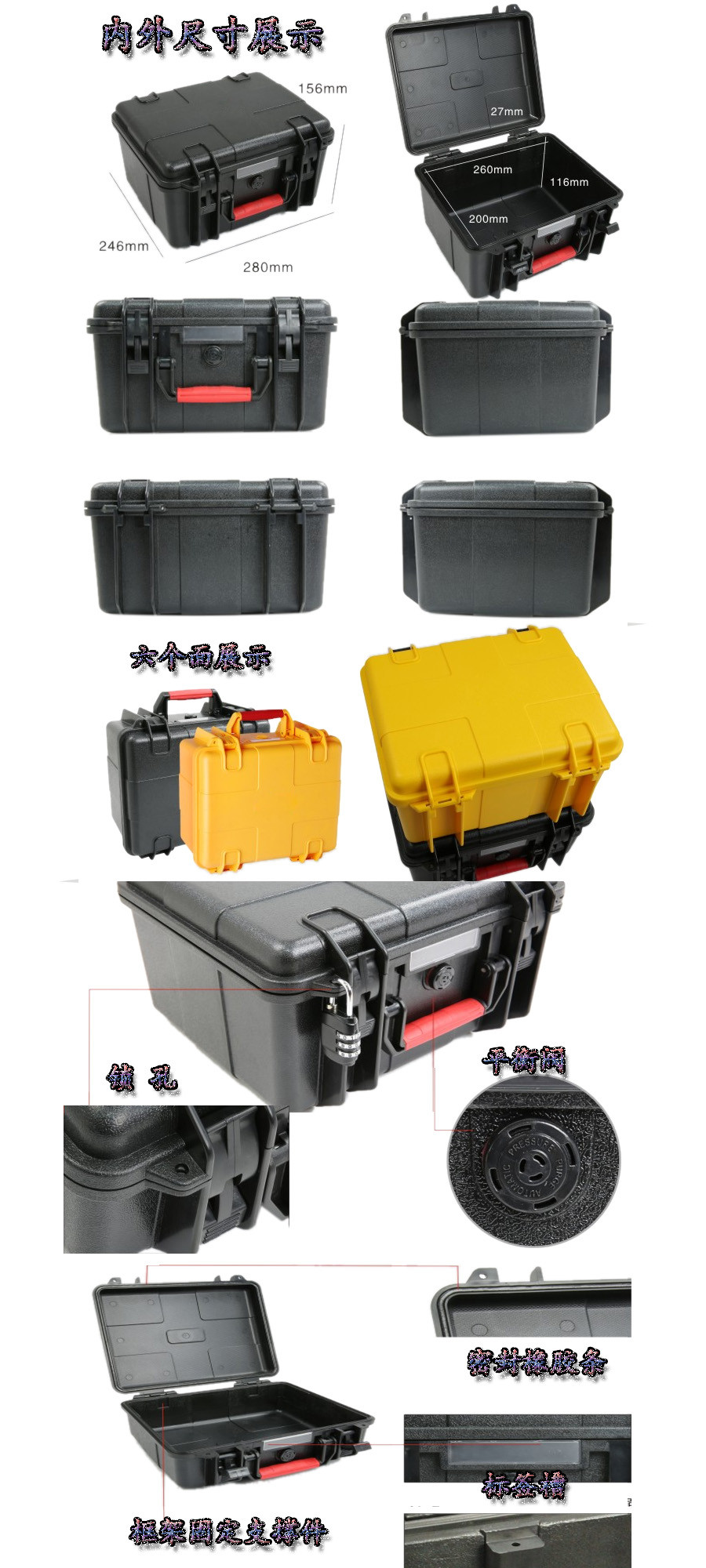 簡(jiǎn)要說(shuō)明:廣泛用于傳媒、公安、消防、軍隊(duì)、航空、戶(hù)外攝影、野外考察、科學(xué)探測(cè)等眾多領(lǐng)域的高端儀器、儀表。具有高強(qiáng)度、高抗壓沖擊、防潮、絕對(duì)密封、防塵、防水等特點(diǎn)。產(chǎn)品材質(zhì):ABS原料,箱體采用高抗沖擊的高分子聚合材料一體注塑成型,密封采用扁型彈性發(fā)泡密封橡膠條,確保防水氣密,所有較軸均采用不銹鋼材質(zhì)。