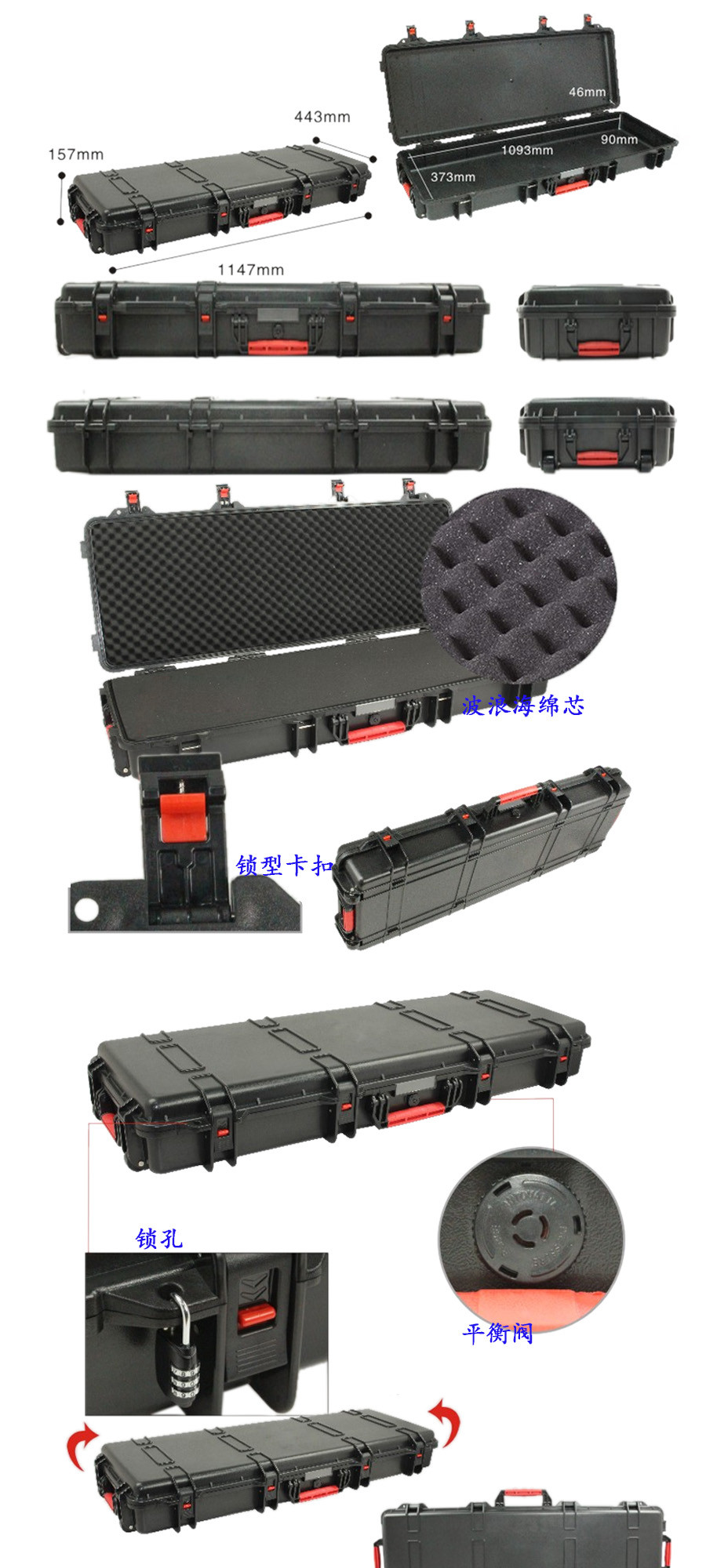 簡(jiǎn)要說(shuō)明:廣泛用于傳媒、公安、消防、軍隊(duì)、航空、戶外攝影、野外考察、科學(xué)探測(cè)等眾多領(lǐng)域的高端儀器、儀表。具有高強(qiáng)度、高抗壓沖擊、防潮、絕對(duì)密封、防塵、防水等特點(diǎn)。產(chǎn)品材質(zhì):ABS原料,箱體采用高抗沖擊的高分子聚合材料一體注塑成型,密封采用扁型彈性發(fā)泡密封橡膠條,確保防水氣密,所有較軸均采用不銹鋼材質(zhì)。
